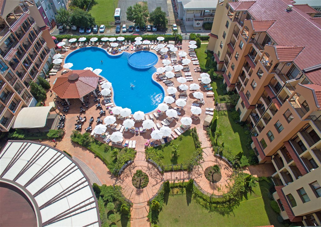 v južnej časti letoviska Slnečné pobrežie • cca 400 metrov k piesočnatým dunám • 1,5 km od historického mesta Nesebar zapísaného na zozname svetového dedičstva UNESCO • letisko Burgas 30 km • počas letnej sezóny premáva minivláčikpo celom stredisku