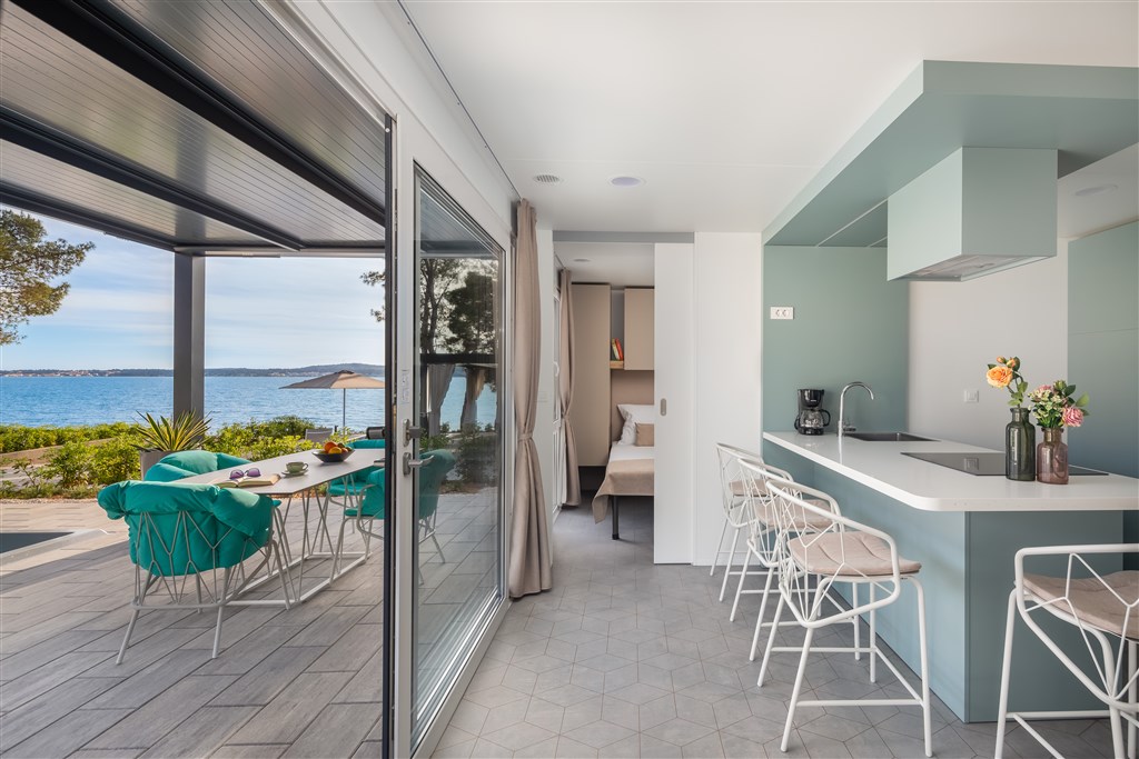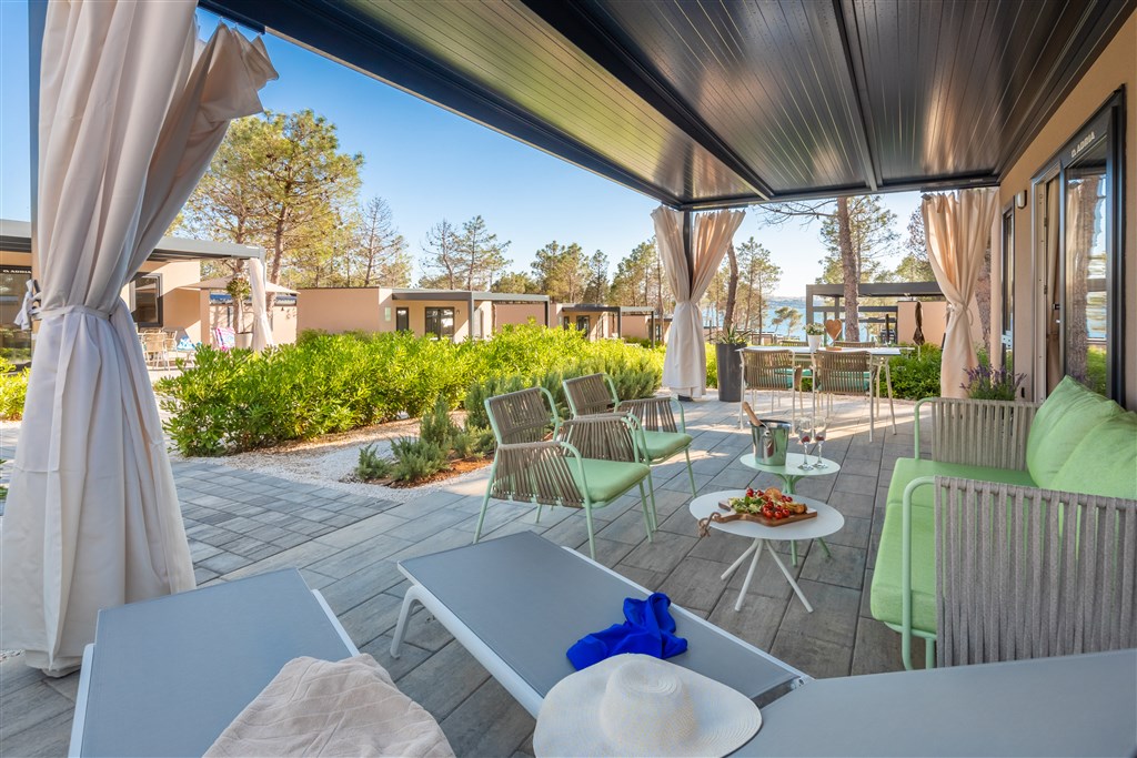v mobilných domčekoch • klimatizácia •2 kúpeľne so sprchovacím kútom • obývacia miestnosť s plne vybavenou kuchynkou (umývačka riadu, kávovar na filtrovanú kávu, rýchlovarná kanvica) • terasa so stolom, 6 stoličkami, 2 ležadlami a slnečníkom