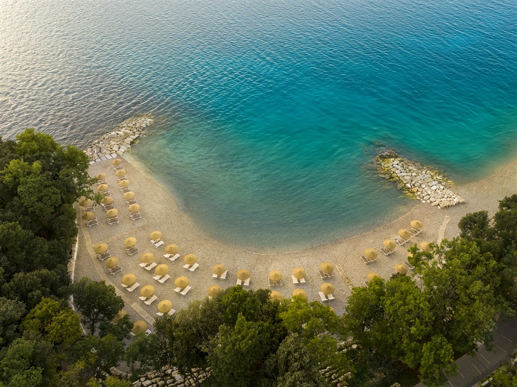vzdialený cca 200 m od prevažne skalnatých pláží s upravenými plochami na slnenie, s maličkými štrkovými zálivčekmi, ktoré lemujú celý polostrov • ležadlá a slnečníky na pláži zdarma (v obmedz. počte)