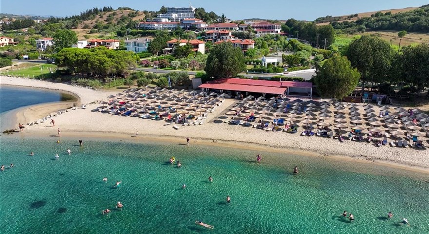na najvýchodnejšom prste polostrova Chalkidiki – Athos • rezort postavený v štýle pokojnej gréckej dedinky leží cca 3,5 km od letoviska Nea Roda a 7 km od mestečka Ouranopolis • areál vyúsťuje do podchodu smerujúcemu na pláž pre hotelových hostí, kam vedie približne 200 m chodník od recepcie popri hotelových ihriskách • upravená piesková pláž, pri vstupe miestami premiešaná s kamienkami, so slnečníkmi a ležadlami (za poplatok) • 110 km od letiska Thessaloniki