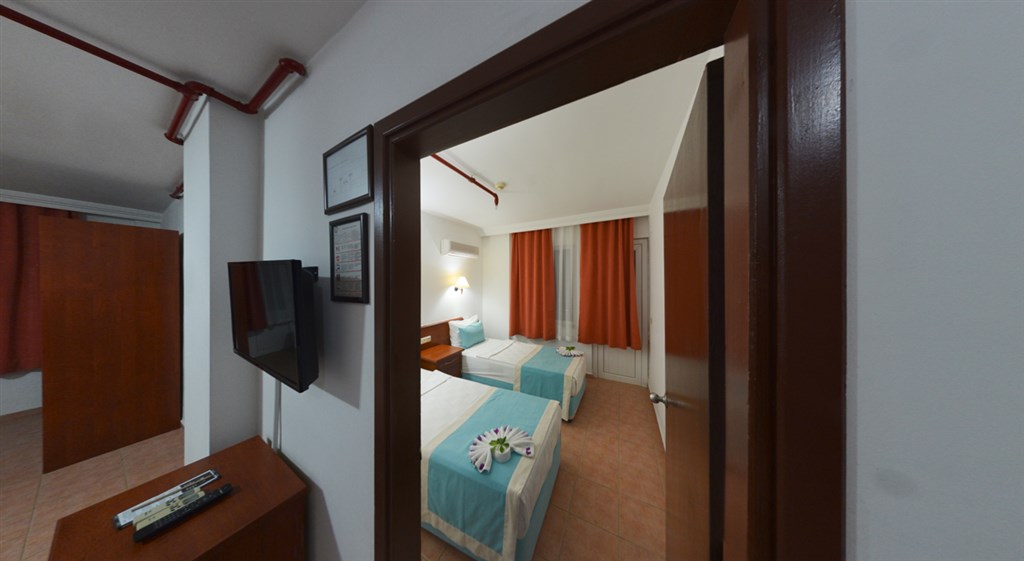 hotelový komplex je zložený z hlavnej a vedľajšej budovy • od piesočnato–kamienkovej pláže je vzdialený cca 100 m • ležadlá a slnečníky na pláži zdarma • plážové osušky za poplatok