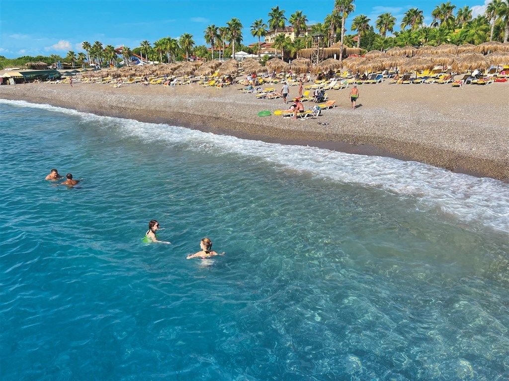 priamo na širokej piesočnatej pláži, premiešanej drobnými kamienkami (plážové osušky za depozit) • plážové mólo • v stredisku Okurcalar • cca 25 km od Manavgatu • 35 km od centra letoviska Alanya • 90 km od medzinárodného letiska v Antalyi