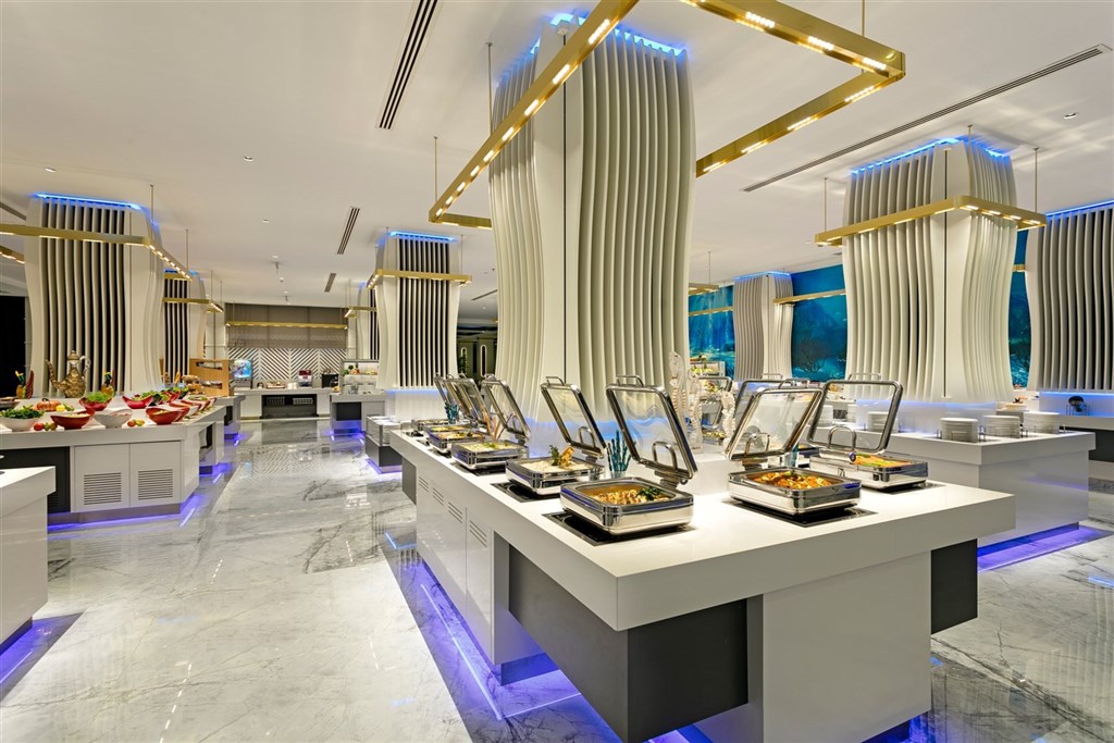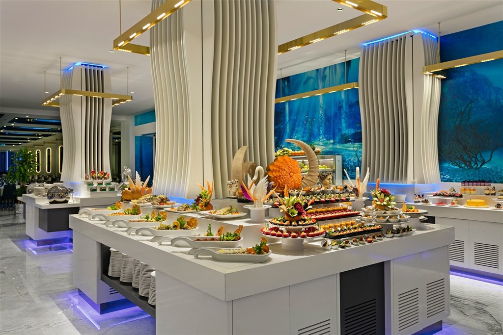 vstupná hala s recepciou • hlavná reštaurácia • 2 snack reštaurácie • 6 a´la carte reštaurácií • lobby bar • pool bar • beach bar • snack bar • ďalšie 2 bary • 5 vonkajších bazénov (rozsiahly bazén, bazén s jacuzzi, detský bazén, vnútorný bazén) • 4 šmykľavky • aquapark pre dospelých so 6 šmykľavkami • SPA a wellness centrum • fitness centrum • športoviská • amfiteáter • vodné športy na pláži • miniklub • detské ihrisko • hotelové animácie a živá hudba • wifi